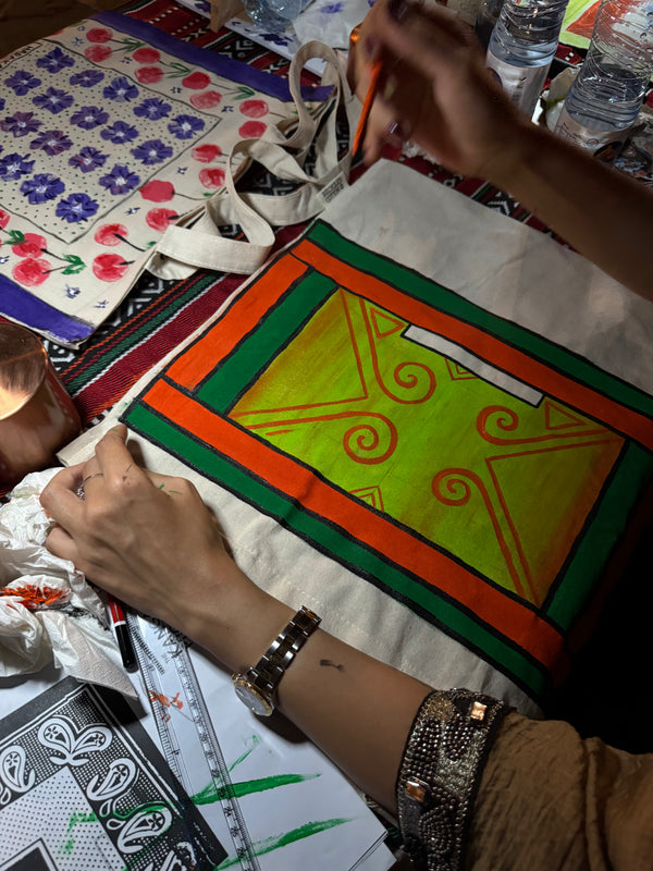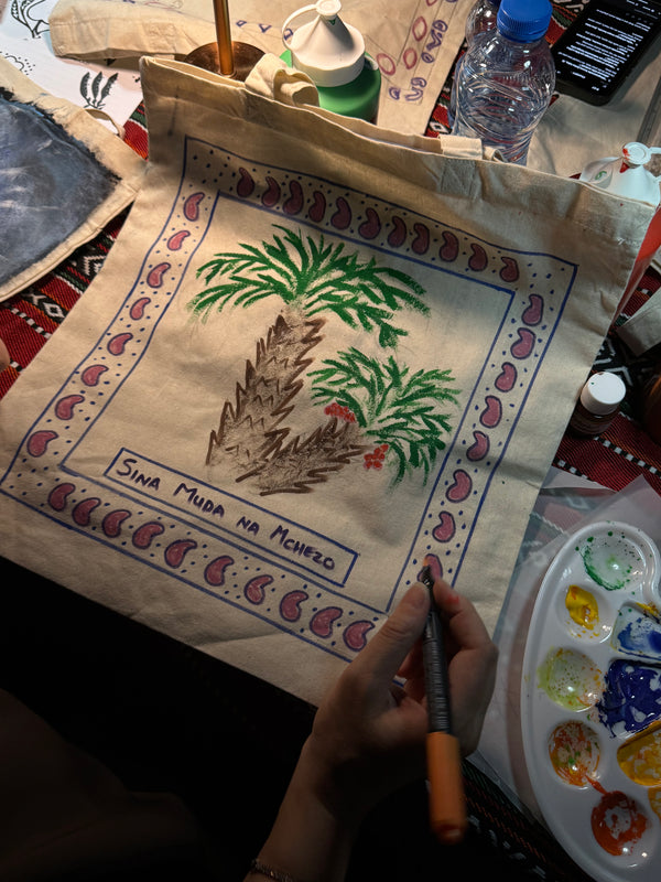 During the workshop, participants immersed themselves in the vibrant world of kanga design, learning about its origins as a printed cotton fabric adorned with borders (pindo) and central squares (mji) imprinted with patterns and proverbs. They then channeled this inspiration into creating personal kanga-inspired tote bag.